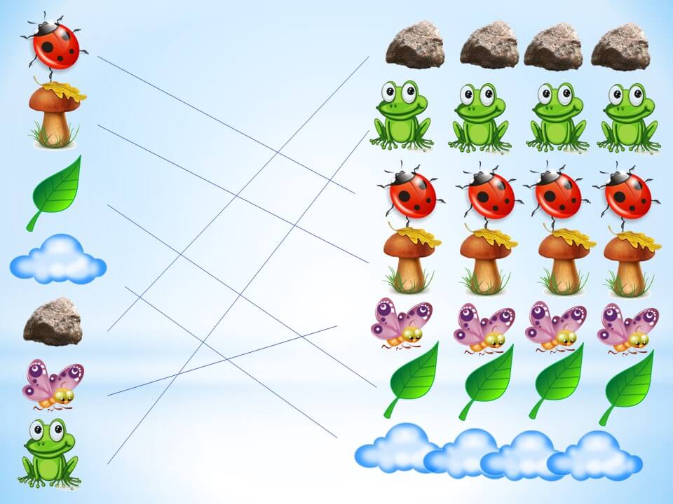 - Крокуємо ми далі, зустрічаємо на своєму шляху Нюшу і Бараша. З якого мультфільму вони до нас прийшли? Вони приготували для нас перше завдання. Якщо виконаємо його правильно, то отримаємо ключ. Перед вами на столиках лежать зображення різних предметів та об’єктів. З одного боку аркуша ці предмети і об’єкти знаходяться по одному, а з іншого – по кілька. Нам потрібно об’єднати в пари ці малюнки і назвати, що ви поєднали між собою, наприклад: «одна квітка – багато квітів…»